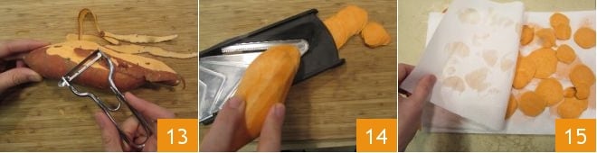 Kümmern Sie sich jetzt um die Kartoffeln: schälen Sie sie 13 und schneiden Sie sie mit einem Mandoline, um Scheiben von etwa 2 mm Dicke 14 zu erhalten. Legen Sie sie nach und nach auf ein Blatt Küchenpapier 15.