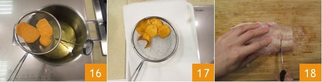 Erhitzen Sie das Öl in einem Topf auf 170°C, tauchen Sie dann jeweils wenige Kartoffelscheiben ein 16 und frittieren Sie sie 3-4 Minuten, bis sie goldbraun sind. Lassen Sie sie dann auf einem Blatt Küchenpapier abtropfen 17 und fahren Sie mit dem Braten der anderen fort. Schneiden Sie inzwischen den Seeteufel zunächst in Scheiben 18