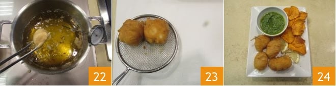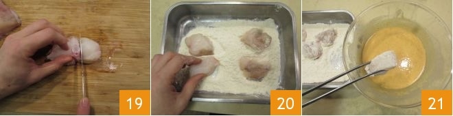 und dann in Stücke, wobei Sie den zentralen Knochen entfernen 19. Sobald Sie mit dem Frittieren der Kartoffeln fertig sind, wenden Sie die Stücke des Seeteufels schnell in Mehl 20. Dann nehmen Sie den Teig aus dem Kühlschrank und tauchen sie darin ein 21.