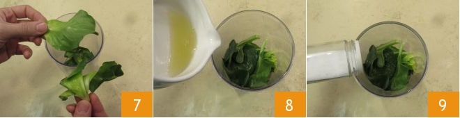 Kümmern Sie sich nun um die Begleitsoße. Geben Sie den Radicchio in den Becher eines Mixers 7, fügen Sie den Zitronensaft 8 und das Salz 9 hinzu.