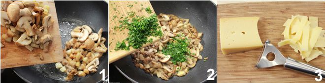Um die Fladen mit Pilzen und Fontina-Fondue zuzubereiten, beginnen Sie mit der Zubereitung der sautierten Pilze: Reinigen Sie alle Pilze gründlich, indem Sie sie abkratzen und mit einem feuchten Tuch abreiben, dann schneiden Sie sie in Stücke und behalten, wenn möglich, die Form des Pilzes bei. Schmelzen Sie 15 g Butter in einer Antihaftpfanne, fügen Sie eine halbierte Knoblauchzehe hinzu und lassen Sie sie goldbraun werden, dann geben Sie die Pilzstücke hinzu 1 und braten diese einige Minuten bei starker Hitze, achten Sie darauf, dass die Pilze nicht zerbrechen. Anschließend die gehackte Petersilie dazugeben 2, salzen und pfeffern und die Garzeit beenden.
