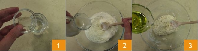 Um das Fladenbrot mit Brombeeren und Gorgonzola zuzubereiten, beginnen Sie mit dem Hefeteig: Lösen Sie die Hefe in Wasser bei Raumtemperatur auf, indem Sie mit einem Holzlöffel umrühren 1, gießen Sie dann die Mischung nach und nach in eine Schüssel mit dem Mehl 2. Kneten Sie weiter, bis der Teig zusammenhält, dann fügen Sie auch das Öl nach und nach hinzu und kneten Sie weiter mit dem Holzlöffel, bis es notwendig wird, die Hände zu benutzen 3.