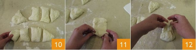 Teilen Sie ihn in 8 gleich große Stücke mit einem Teigschneider 10 und formen Sie jedes Teigstück, indem Sie die Ränder zur Mitte falten (11-12).