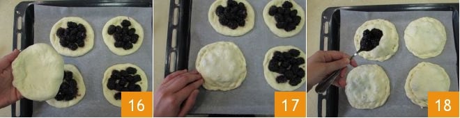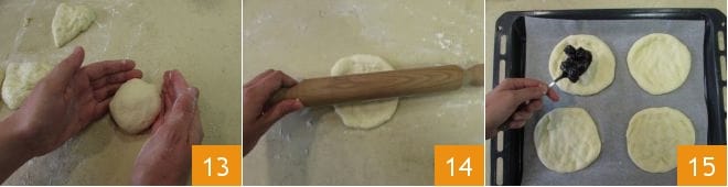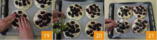 Formen Sie eine Kugel 13, drücken Sie sie dann mit einem Nudelholz oder mit den Fingerspitzen flach 14 und legen Sie die ersten 4 Fladenbrote auf das mit Backpapier ausgelegte Backblech. Legen Sie die Brombeeren in die Mitte, die inzwischen etwas mariniert sind, und lassen Sie einen Rand von 1,5 cm frei 15.
