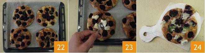 Backen Sie die Fladenbrote bei 190° im statischen Ofen für 40-45 Minuten, bis sie gut gebräunt sind 22. Sobald Sie das Backblech herausnehmen, bestreuen Sie sie mit den Käsestücken 23 und servieren Sie die Fladenbrote mit Brombeeren und Gorgonzola noch heiß 24!
