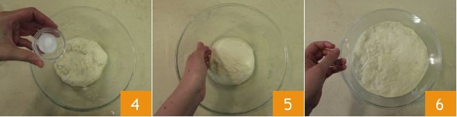 Fügen Sie das Salz hinzu 4 und kneten Sie weiter für ein paar Minuten 5. Übertragen Sie den Teig in eine geölte Schüssel und decken Sie ihn mit Frischhaltefolie ab; lassen Sie ihn an einem warmen Ort für ein paar Stunden oder bis er sein Volumen verdoppelt hat, aufgehen 6.