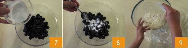 Bevor Sie den Teig ausrollen, geben Sie die Brombeeren in eine Schüssel 7, würzen Sie mit Zucker 8, mischen Sie und stellen Sie sie beiseite. Nehmen Sie den Teig und legen Sie ihn auf die leicht bemehlte Arbeitsfläche 9.