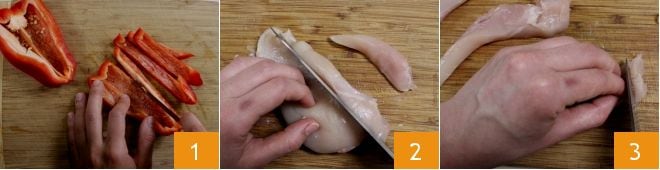Um die Fladenbrote mit Paprika-Hähnchen und roten Paprikaschoten zuzubereiten, beginnen Sie mit den Paprikaschoten. Waschen Sie sie unter kaltem fließendem Wasser, entfernen Sie dann die Kappe und teilen Sie sie in der Mitte. Nehmen Sie die für das Rezept benötigte Menge und entfernen Sie die Kerne, schneiden Sie sie zunächst in Streifen 1 und dann in dünne Stäbchen von etwa 4 cm Länge. Sammeln Sie sie in einer Schüssel. Nehmen Sie inzwischen die Hähnchenbrust, entfernen Sie bei Bedarf die fetteren Teile und schneiden Sie sie in Streifen 2, dann teilen Sie diese nochmals 3.