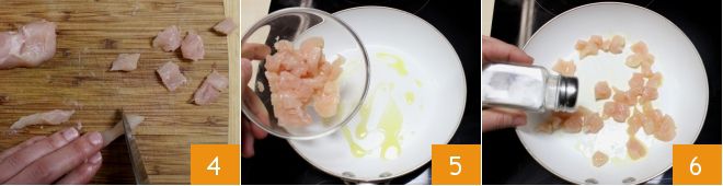 Schneiden Sie dann kleine Stückchen von etwas mehr als 1 cm 4. Erhitzen Sie in einer Pfanne einen Schuss Öl und fügen Sie die Hähnchenstückchen hinzu 5. Lassen Sie sie einen Moment anbraten, indem Sie umrühren, damit sie von allen Seiten anbraten. Würzen Sie dann nach Ihrem Geschmack mit Salz.