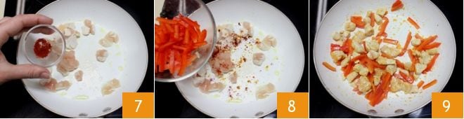 Fügen Sie dem Hähnchen auch die süße Paprika (oder scharfe, wenn Sie es bevorzugen) hinzu 7 und dann die Paprikastücke, die Sie beiseitegelegt hatten 8. Rühren Sie um und kochen Sie bei mittlerer Hitze 15 Minuten 9, wobei Sie die Zutaten häufig umrühren. Falls nötig, können Sie etwas Wasser hinzufügen, um das Garen zu erleichtern.