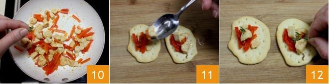 Am Ende der Garzeit zerbröseln Sie mit den Händen die frischen Thymianblättchen in der Pfanne 10 und schalten Sie die Hitze aus. Lassen Sie das Paprika-Hähnchen mit den Paprikaschoten etwas abkühlen, dann beginnen Sie, Ihre Fladenbrote zu belegen: Helfen Sie sich mit einem Teelöffel, um jedes Fladenbrot zu füllen 11 und nach Ihrem Belieben können Sie noch einige Thymianblättchen hinzufügen 12. Servieren Sie Ihre Fladenbrote mit Paprika-Hähnchen und roten Paprikaschoten als köstliches Fingerfood!