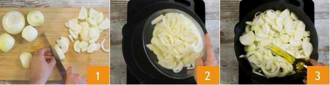 Um das Fladenbrot mit Taleggio und karamellisierten Zwiebeln zuzubereiten, schälen Sie zuerst die Zwiebeln und schneiden Sie sie in Scheiben von etwa 3-4 mm Dicke 1. Erhitzen Sie die Zwiebeln in einer Pfanne 2 mit etwas Öl 3.