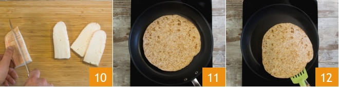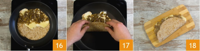 Schneiden Sie den Taleggio in Scheiben von etwa ½ cm 10. Erhitzen Sie das Vollkorn-Fladenbrot in einer Pfanne für etwa 30 Sekunden 11, drehen Sie das Fladenbrot 12 um es weitere 30 Sekunden zu erwärmen.