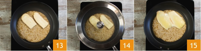 Verteilen Sie die Taleggio-Scheiben nur auf einer Hälfte 13, decken Sie mit einem Deckel ab 14 und lassen Sie den Taleggio bei niedriger Flamme schmelzen 15.