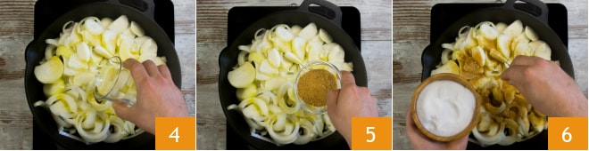 Gießen Sie auch das Wasser 4, den braunen Zucker 5 hinzu und würzen Sie mit Salz 6.