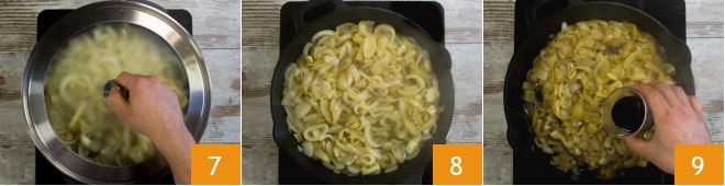 Rühren Sie um, decken Sie die Pfanne mit einem Deckel ab 8 und lassen Sie das Ganze etwa 20 Minuten bei niedriger Hitze köcheln, gelegentlich umrühren. Nach dieser Zeit den Deckel abnehmen 8 und weitere 45 Minuten bei milder Hitze kochen, häufig umrühren. Wenn die Zwiebeln schön weich sind, den Balsamico-Essig 9 hinzufügen, verdampfen lassen und dann die Hitze ausschalten.