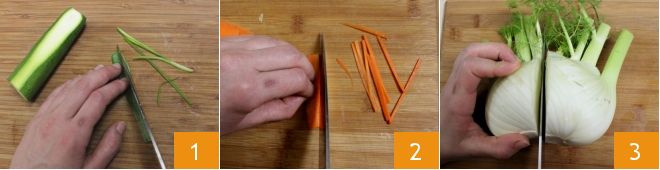 Um die Fladenbrote mit Gemüsestreifen und Asiago zuzubereiten, beginnen Sie mit dem Säubern und Schneiden des Gemüses in Streifen (Sie können auch die Kochschule konsultieren: Wie man Gemüse schneidet). Waschen Sie das Gemüse gründlich unter fließendem Wasser, dann schneiden Sie die Zucchini in Streifen 1. Machen Sie dasselbe mit den Karotten 2, nachdem Sie die Enden entfernt und geschält haben. Schneiden Sie dann den Fenchel in zwei Hälften 3.