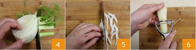 Entfernen Sie die Spitzen und die härtere äußere Schicht 4. Schneiden Sie dann die benötigte Menge Fenchel in Streifen 5. Entfernen Sie danach die äußere Schicht des Selleries mit einem Sparschäler 6.