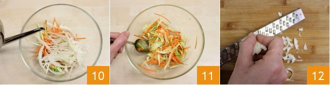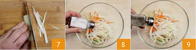 Schneiden Sie auch den Sellerie in Streifen 7 und geben Sie das Gemüse in eine Schüssel. Salzen und pfeffern Sie nach Geschmack (8-9).