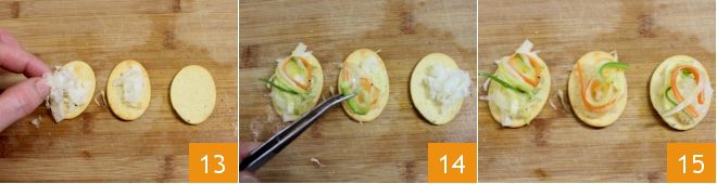 Beginnen Sie mit dem Käse, um die Fladenbrote zu belegen: Legen Sie einen kleinen Haufen Späne auf jedes Fladenbrot 13. Verwenden Sie dann die Küchenzange, um die Gemüsestreifen hinzuzufügen 14. Beenden Sie diesen Vorgang für alle Fladenbrote 15 und legen Sie sie dann auf ein Schneidebrett oder eine Servierplatte, um sie Ihren Gästen anzubieten!