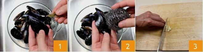 Um die Fladenbrote mit Miesmuscheln, Bottarga und Zitronenschale zuzubereiten, beginnen Sie mit der Reinigung der Miesmuscheln: Sie können auch die Kochschule Wie man Miesmuscheln reinigt konsultieren. Waschen Sie sie gründlich unter fließendem Wasser, entfernen Sie das Bärtchen 1, also den Bart, der aus der Schale herausragt, und reiben Sie die Schale mit einem Schwamm 2 oder kratzen Sie sie mit der Klinge eines kleinen Messers ab. Schälen und hacken Sie die Knoblauchzehe fein 3 und braten Sie sie in einer großen Pfanne mit einem Schuss Öl an; wenn Sie möchten, können Sie auch frischen Chili hinzufügen.