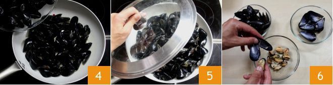 Geben Sie die Miesmuscheln in die Pfanne 4, rühren Sie um und decken Sie sie mit einem Deckel ab 5, damit sich die Schalen öffnen: dies dauert etwa 5 Minuten. Während die Miesmuscheln kochen, entfernen Sie die gelbe Schale der unbehandelten Zitrone mit einem Messer und schneiden Sie sie in hauchdünne Streifen. Wenn sich die Miesmuscheln geöffnet haben, lassen Sie das Wasser ab und schälen Sie sie 6.