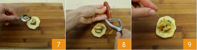 Jetzt können Sie Ihre Fladenbrote zusammenstellen, indem Sie zuerst 2-3 Miesmuscheln auf jedes Fladenbrot legen 7; dann reiben Sie Bottarga vom Rogen 8 oder Thunfisch darüber und dekorieren mit ein paar Streifen Zitronenschale 9. Ihre Fladenbrote mit Miesmuscheln, Bottarga und Zitronenschale sind bereit zum Genießen!