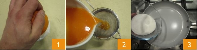 Um die flambierten Bananen zuzubereiten, beginnen Sie damit, die Orange auszupressen 1 und den Saft zu filtern 2. Nehmen Sie dann eine Antihaftpfanne und lassen Sie den Zucker schmelzen 3.
