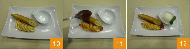 Jetzt, da die Bananen gar sind, schneiden Sie eine halbe Banane in Scheiben 10 und arrangieren sie auf einem Dessertteller. Legen Sie die andere Banane neben die geschnittene und gießen Sie die Karamellsauce über beide 11. Sie können die flambierte Banane ganz lassen oder in Scheiben schneiden und nebeneinander legen, um eine elegante Präsentation der Frucht zu erzielen. Sie können diese köstlichen flambierten Bananen auch mit einer Kugel Vanille- oder Schokoladeneis servieren.