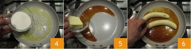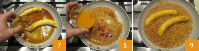Fügen Sie an dieser Stelle den Rum hinzu 7 und lassen Sie ihn Feuer fangen, indem Sie die Pfanne leicht zur Flamme neigen oder einen Küchenbrenner verwenden. Wenn die Flammen schwächer geworden sind und vollständig verschwinden, nehmen Sie die Bananen aus der Pfanne und stellen sie beiseite. In das restliche Karamell in der Pfanne geben Sie den Orangensaft 8 hinzu und emulgieren mit einem Holzlöffel. Legen Sie dann die Bananen zurück in die Pfanne und kochen Sie sie erneut, indem Sie sie für eine gleichmäßige Garung wenden 9.