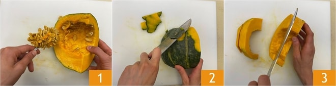 Um den Kürbisflan zuzubereiten, entfernen Sie zuerst die inneren Samen des Kürbisses 1 und schälen Sie ihn 2. Sie benötigen 450 g gut gereinigten Kürbis. Schneiden Sie ihn dann in 4 Spalten 3.