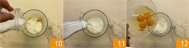 Fügen Sie Sahne 10, Milch 11 und die Eier 12 hinzu.