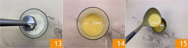 Mixen Sie alles mit dem Stabmixer 13, bis Sie eine komplett glatte Creme erhalten 14. Füllen Sie die Mischung in 8 zuvor gebutterte Stahlförmchen mit einem Fassungsvermögen von 125 ml; helfen Sie sich dabei mit einer Kelle 15. Füllen Sie sie so, dass etwa 2 cm zum Rand frei bleiben.