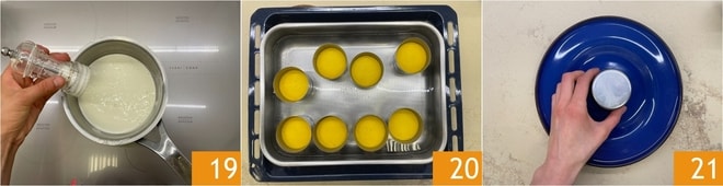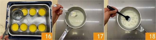 Stellen Sie die Förmchen in eine ausreichend große Backform, fügen Sie heißes Wasser hinzu, bis die Hälfte der Höhe der Förmchen erreicht ist 16. Stellen Sie sie in den vorgeheizten statischen Ofen bei 160° für 35 Minuten. In der Zwischenzeit widmen Sie sich der Creme. Gießen Sie die Sahne in einen Topf und erhitzen Sie sie bis kurz vor dem Kochen. Schalten Sie die Hitze aus und fügen Sie die Crescenza in Löffeln hinzu 17. Rühren Sie zuerst mit einem Spatel 18 und dann mit einem Schneebesen, bis der Käse geschmolzen ist.