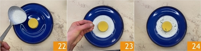 Salzen, pfeffern 19 und bei Bedarf, um eine glattere Konsistenz zu erhalten, pürieren Sie die Creme für einige Sekunden mit einem Stabmixer. Nehmen Sie die Flans aus dem Ofen 20 und lassen Sie sie leicht abkühlen, dann nehmen Sie einen und übertragen ihn auf einen Servierteller, indem Sie die Form umdrehen 21. Wenn er schwer herauskommt, können Sie mit einem Messer mit glatter Klinge nachhelfen, indem Sie es entlang des Randes gleiten lassen.