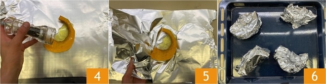 Legen Sie jede Scheibe auf ein Stück Aluminiumfolie und würzen Sie sie mit Öl, Salz und Pfeffer 4. Schließen Sie die Päckchen und wiederholen Sie dies für die anderen Stücke. Legen Sie sie auf ein Backblech und backen Sie sie im vorgeheizten statischen Ofen bei 200° für 30 Minuten.