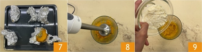 Nach den 30 Minuten testen Sie die Konsistenz, indem Sie das Fruchtfleisch mit einer Gabel einstechen, um zu überprüfen, ob der Kürbis gekocht und weich ist, indem Sie ihn mit einer Gabel anstechen. Zu diesem Zeitpunkt sollte Ihr Kürbis 360 g wiegen, geben Sie ihn in einen hohen und schmalen Behälter und pürieren Sie ihn mit einem Stabmixer 8, bis Sie ein Püree erhalten. Fügen Sie auch den geriebenen Grana Padano hinzu 9.