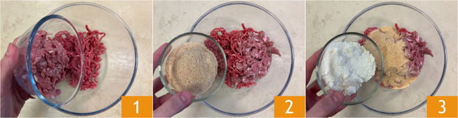 Um die Fleischbällchen mit Cheddar und Speck zuzubereiten, geben Sie das Rinder- und Schweinehackfleisch in eine Schüssel 1, fügen dann die Semmelbrösel 2 und den geriebenen Parmigiano Reggiano hinzu 3.