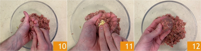 Entnehmen Sie etwa 40 g der Masse und formen Sie eine Kugel in Ihrer Handfläche 10, dann in die Mitte einige Cheddar-Würfel einfügen 11 und wieder zu einer runden Form schließen 12. Fahren Sie auf diese Weise fort, um alle Fleischbällchen zu formen; mit diesen Mengen erhalten Sie etwa 18 Stück.