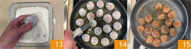 Wälzen Sie die Fleischbällchen im Mehl 13, dann braten Sie sie in einer Pfanne mit heißem Öl etwa 7 Minuten an, indem Sie sie von beiden Seiten wenden 14 15.
