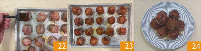 Backen Sie im vorgeheizten statischen Ofen bei 230° für 10 Minuten. Wenn sie schön goldbraun sind, nehmen Sie die Fleischbällchen aus dem Ofen und bestreichen sie mit Barbecue-Sauce 22, dann erneut für 1-2 Minuten backen 23. Mit gehacktem Schnittlauch garnieren und Ihre Fleischbällchen mit Cheddar und Speck sofort servieren 24!