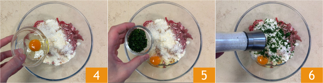 Fügen Sie auch das Ei 4, die fein gehackte Petersilie 5, Salz 6 und Pfeffer hinzu.