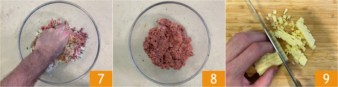 Kneten Sie mit den Händen, um die Zutaten zu vermischen 7 und eine homogene Masse zu erhalten 8. Jetzt den Cheddar in sehr kleine Würfel schneiden 9.