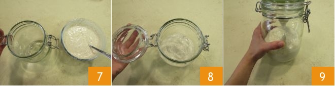 Gebt die Mischung hinein (7-8) und verschließt das Glas 9. Auf diese Weise kann die Luft hinein und die von den Hefen erzeugten Gase können entweichen, wobei vermieden wird, dass sich das Mehl vom Wasser trennt. Sollte dies dennoch passieren, keine Sorge, einfach mischen.