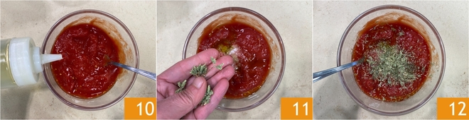 Bereiten Sie in der Zwischenzeit den Belag vor: Geben Sie die geschälten Tomaten in eine Schüssel und würzen Sie mit Öl 10, Salz und Oregano 11, dann zerdrücken und mischen Sie mit einer Gabel 12.