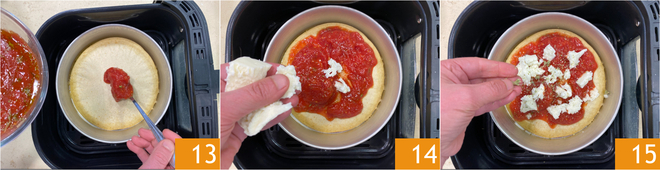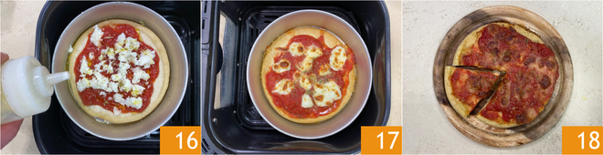 Vervollständigen Sie mit einem Schuss Öl 16 und backen Sie weitere 8 Minuten, immer bei 200°C. Sobald sie gebacken ist 17, ist Ihre flüssige Pizza in der Heißluftfritteuse bereit, genossen zu werden 18!