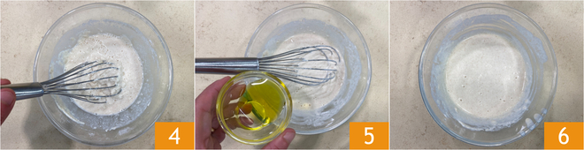 Integrieren Sie nach und nach das Wasser, indem Sie mit einem Schneebesen rühren 4. Zum Schluss fügen Sie das Öl hinzu 5 und rühren, um es zu integrieren und eine homogene Mischung zu erhalten 6. Sie sollten einen dicken Teig erhalten.