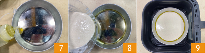 Fetten Sie eine Form mit 20 cm Durchmesser mit Öl ein 7 und gießen Sie den Teig hinein 8. Platzieren Sie die Form in der Heißluftfritteuse (wir haben eine Fritteuse mit einem Fassungsvermögen von 6 Litern verwendet) und backen Sie bei 200°C für 5 Minuten 9.