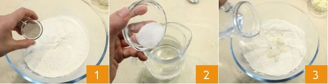 In einer Schüssel das gesiebte Mehl mit der Trockenhefe mischen 1, das Salz im Wasser auflösen 2 und dann zu den trockenen Zutaten geben 3,