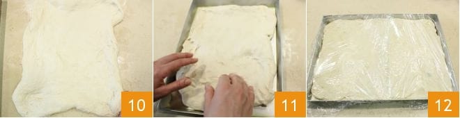 den Teig mit den Händen auf einer leicht geölten Fläche ausbreiten, ihm eine rechteckige Form geben 10 und dann in eine gut geölte 35x28 cm Form legen 11. Decken Sie den ausgebreiteten Teig mit Folie ab 12 und lassen Sie ihn weitere 1 Stunde gehen, bis die Focaccia den Rand des Blechs erreicht.